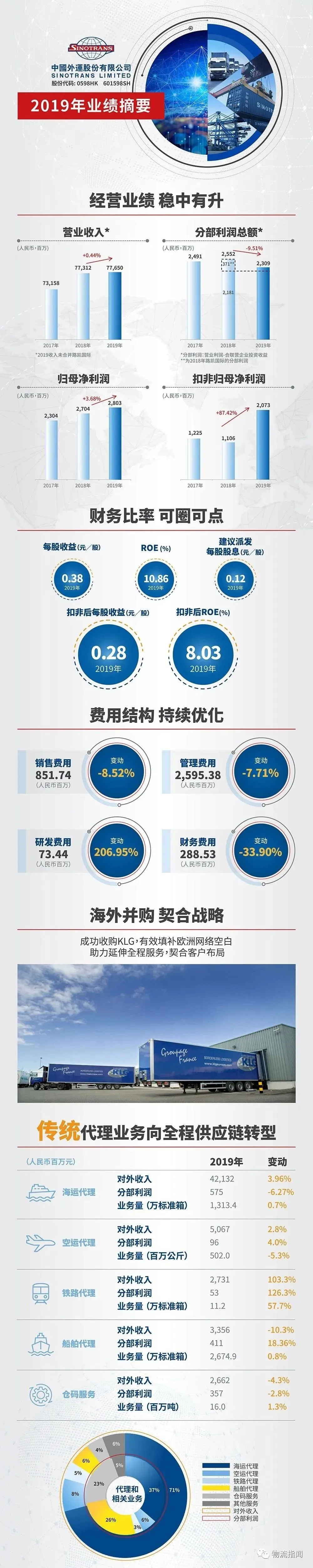 據(jù)悉,2019年,中國外運(yùn)實(shí)現(xiàn)營業(yè)收入776.50億元,同比增長0.44%(可比口徑下實(shí)現(xiàn)增長2.4%);分部利潤實(shí)現(xiàn)23.09億,可比口徑下實(shí)現(xiàn)增長5.9%。實(shí)現(xiàn)歸母凈利潤28.03億元,同比增長3.68% ;實(shí)現(xiàn)扣非后的歸母凈利潤20.73億元,同比增長87.42%。每股收益為0.38元人民幣??鄯呛蟮腞OE增長了3.08個百分點(diǎn)。