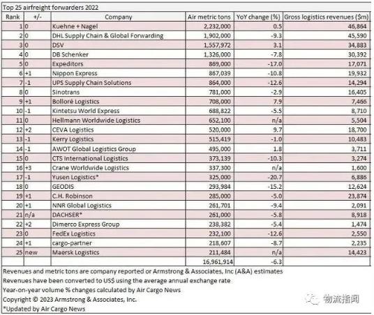7月11日消息,第三方物流咨詢機(jī)構(gòu)Armstrong&Associates.Inc發(fā)布了最新的2022年航空貨代TOP25排名。前25家空運貨代公司的總貨量同比下降了6.3%,達(dá)到1690萬噸。其中,前五名延續(xù)去年的排名,分別為德迅(K+N)、DHL、DSV、DB Schenker、Expeditors。德迅憑借223萬噸的空運貨量,進(jìn)一步擴(kuò)大了對DHL的領(lǐng)先優(yōu)勢,再次成為全球最大航空貨運代理公司。排名第二的DHL去年空運貨物量下降了9.3%,達(dá)到190萬噸,反映出了整體空運貨代市場的情況。