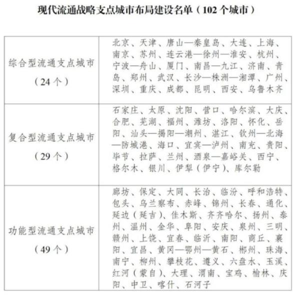 《通知》堅持系統(tǒng)思維和全局觀念,突出國家所需和城市所長,按照服務(wù)重要商品和資源要素流通、強化跨域跨界輻射帶動、促進(jìn)現(xiàn)代流通發(fā)展等三個維度布局流通支點城市。綜合考慮城市資源稟賦、發(fā)展基礎(chǔ)、比較優(yōu)勢、未來潛力,將102個城市納入布局建設(shè)范圍,覆蓋全國31個省區(qū)市以及新疆生產(chǎn)建設(shè)兵團。流通支點城市將按綜合型、復(fù)合型、功能型分類推進(jìn)建設(shè),城市人民政府發(fā)揮主體作用部署推進(jìn),努力提升自身發(fā)展水平,增強輻射帶動作用。
