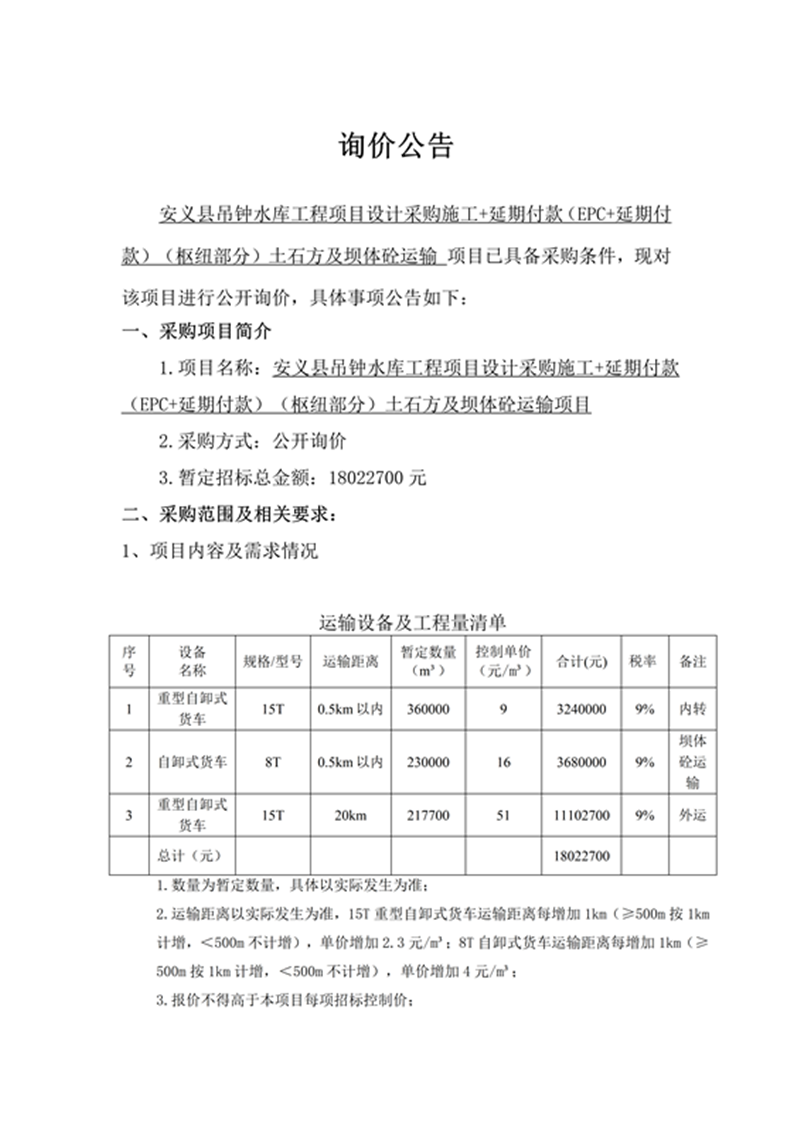安義縣吊鐘水庫(kù)工程項(xiàng)目設(shè)計(jì)采購(gòu)施工+延期付款(EPC+延期付款)(樞紐部分)土石方及壩體砼運(yùn)輸項(xiàng)目詢價(jià)公告