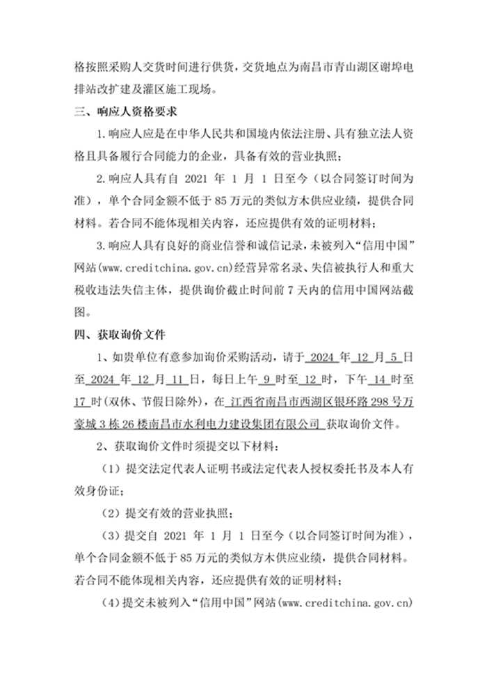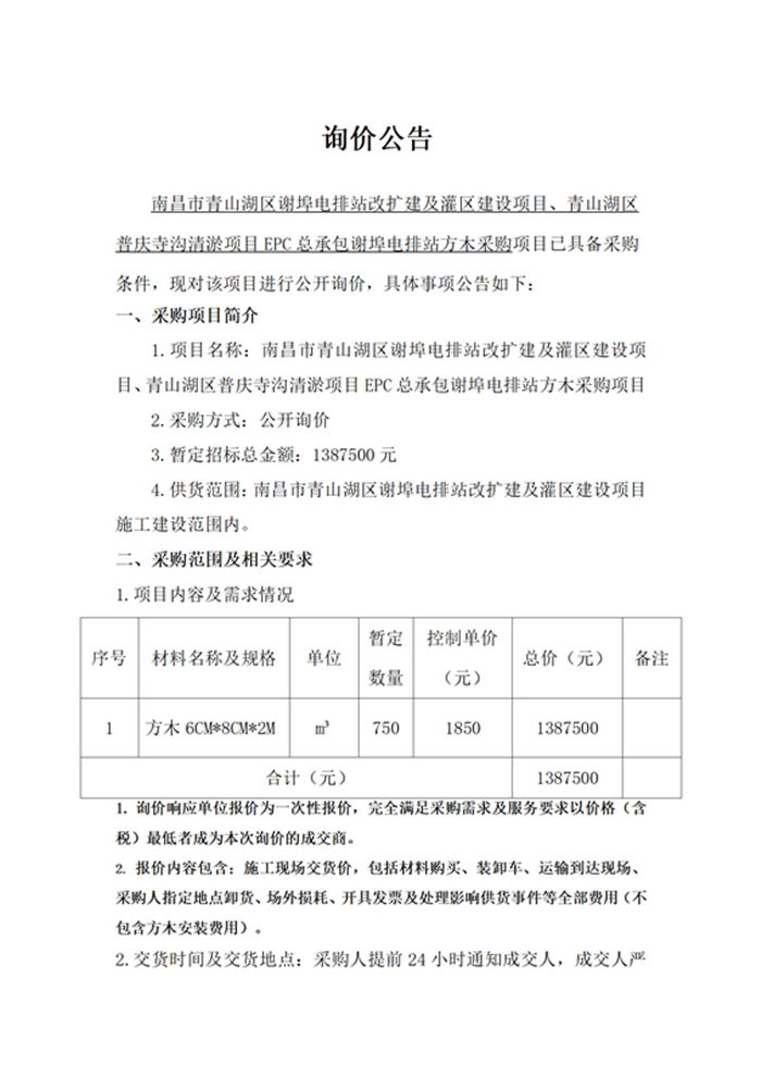 南昌市青山湖區(qū)謝埠電排站改擴建及灌區(qū)建設(shè)項目、青山湖區(qū)普慶寺溝清淤項目EPC總承包謝埠電排站方木采購項目詢價公告
