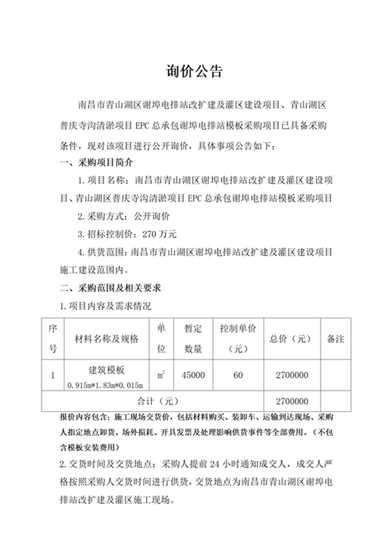 南昌市青山湖區(qū)謝埠電排站改擴(kuò)建及灌區(qū)建設(shè)項(xiàng)目、青山湖區(qū)普慶寺溝清淤項(xiàng)目EPC總承包謝埠電排站模板采購(gòu)項(xiàng)目詢價(jià)公告