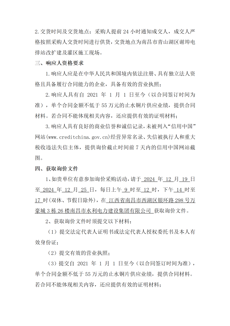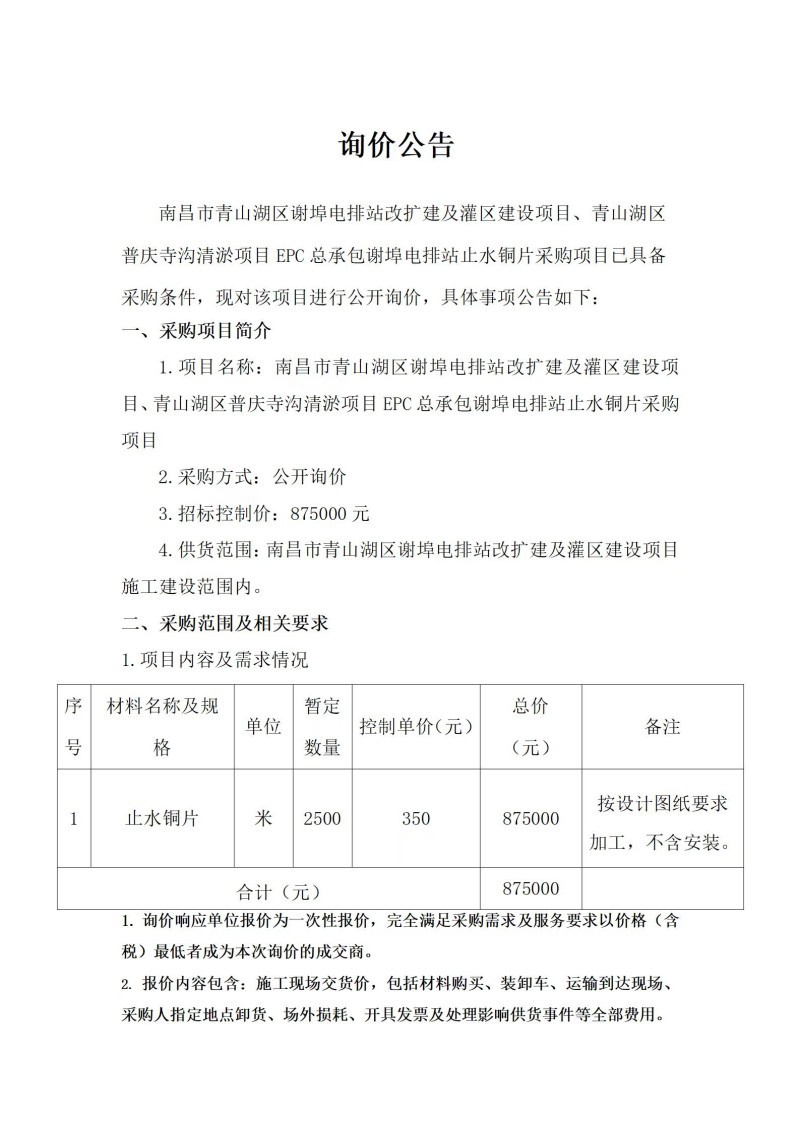 南昌市青山湖區(qū)謝埠電排站改擴建及灌區(qū)建設(shè)項目、青山湖區(qū)普慶寺溝清淤項目EPC總承包謝埠電排站止水銅片采購項目詢價公告