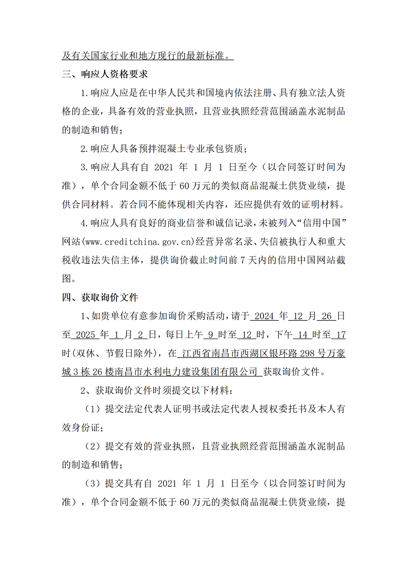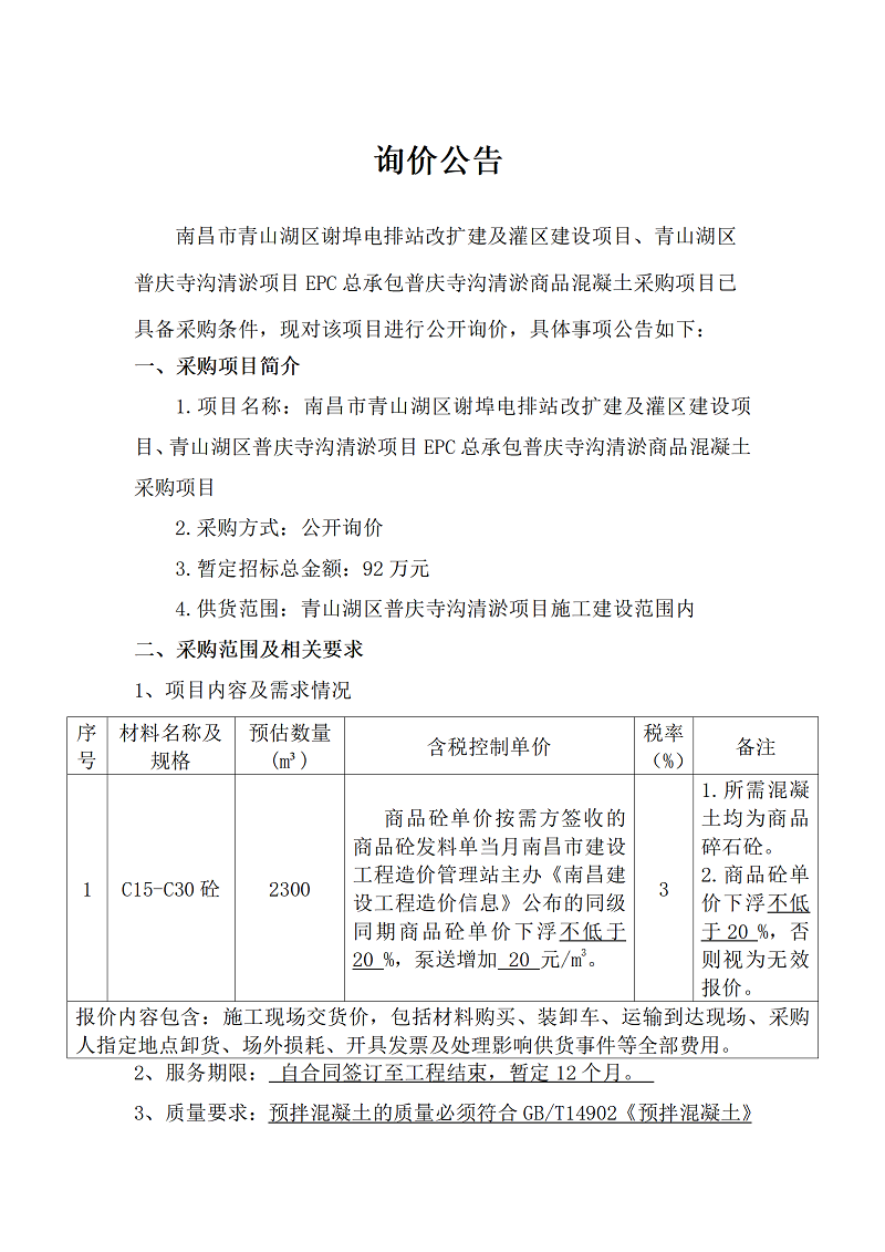 南昌市青山湖區(qū)謝埠電排站改擴建及灌區(qū)建設(shè)項目、青山湖區(qū)普慶寺溝清淤項目EPC總承包普慶寺溝清淤商品混凝土采購項目詢價公告