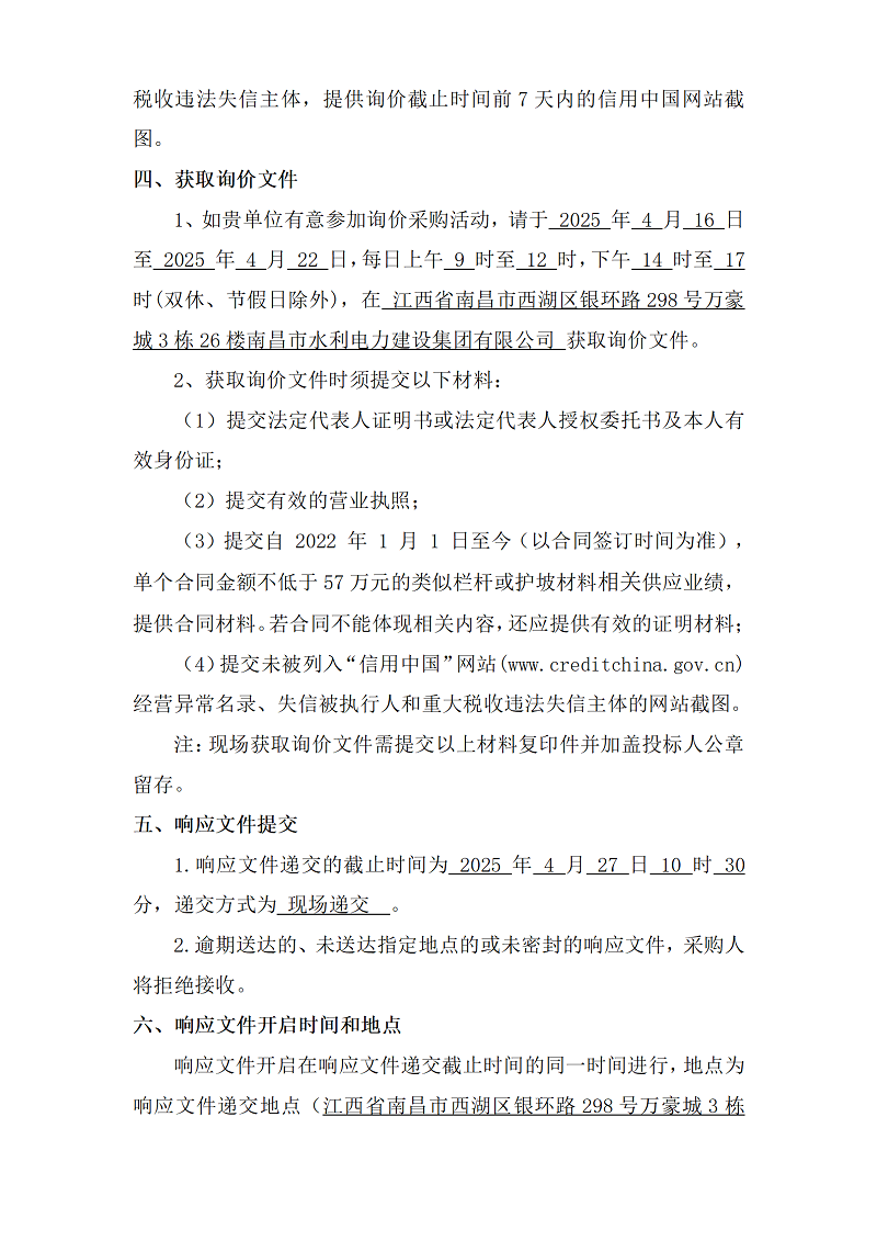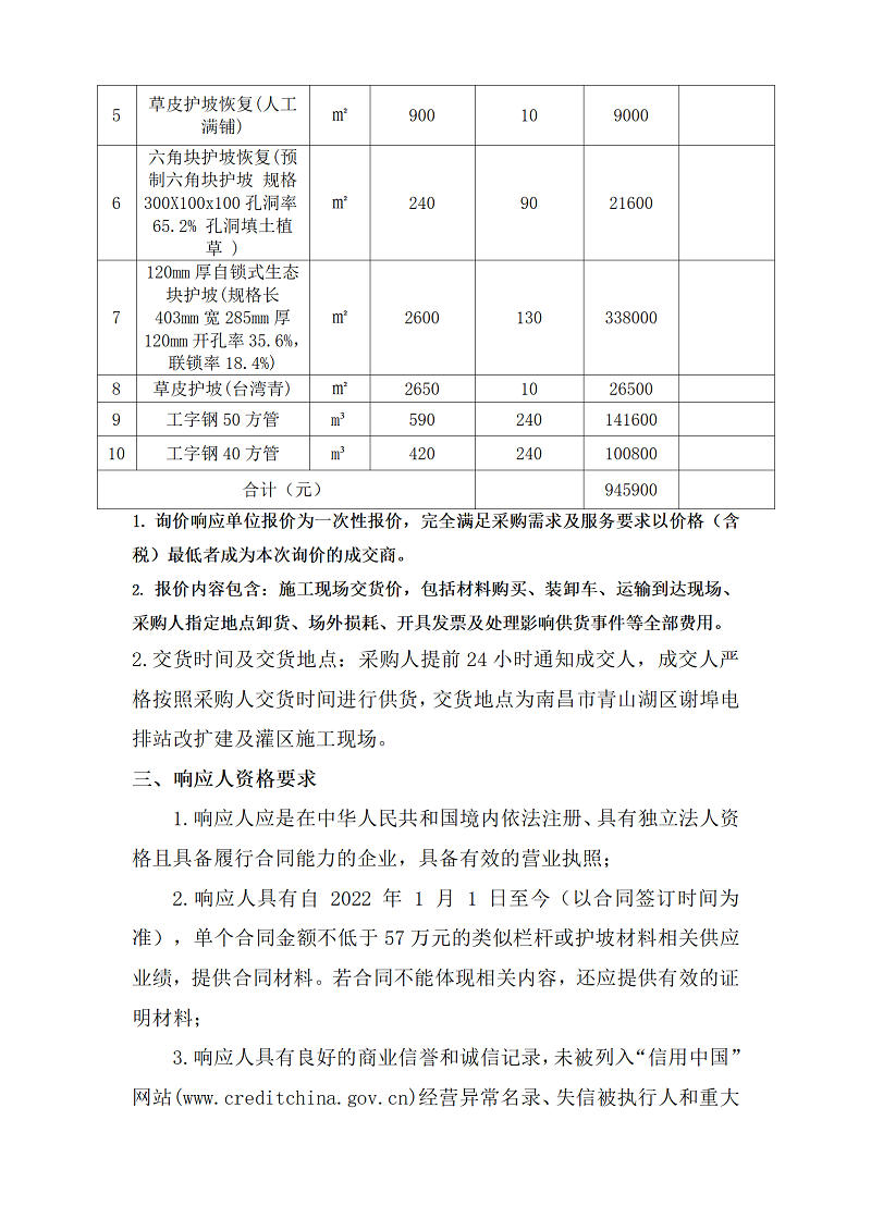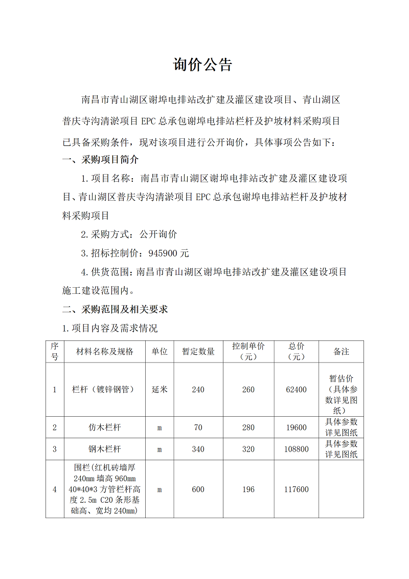 南昌市青山湖區(qū)謝埠電排站改擴(kuò)建及灌區(qū)建設(shè)項(xiàng)目、青山湖區(qū)普慶寺溝清淤項(xiàng)目EPC總承包謝埠電排站欄桿及護(hù)坡材料采購項(xiàng)目詢價(jià)公告